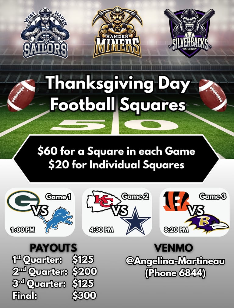 The West Haven Sailors, Hamden Miners, and Waterbury Silverbacks are teaming up for a holiday fundraiser, and you can get in on the action during the 3 NFL games on Thanksgiving Day!